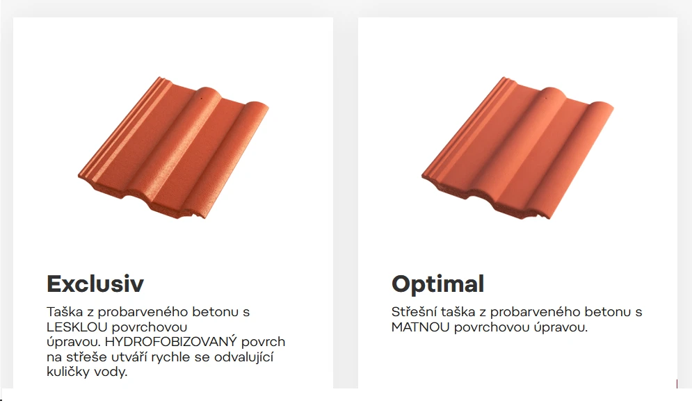 Exclusiv - taška z probarveného betonu s LESKLOU povrchovou úpravou. Je exkluzivním řešením pro objekty s vysokými estetickými požadavky. Taška má HYDROFOBIZOVANÝ povrch, kdy kapky na střeše utváří rychle se odvalující kuličky vody. Tím dochází k rychlému odvodu nečistot ze střechy a není zde prostor pro usazování mechů a lišejníků.