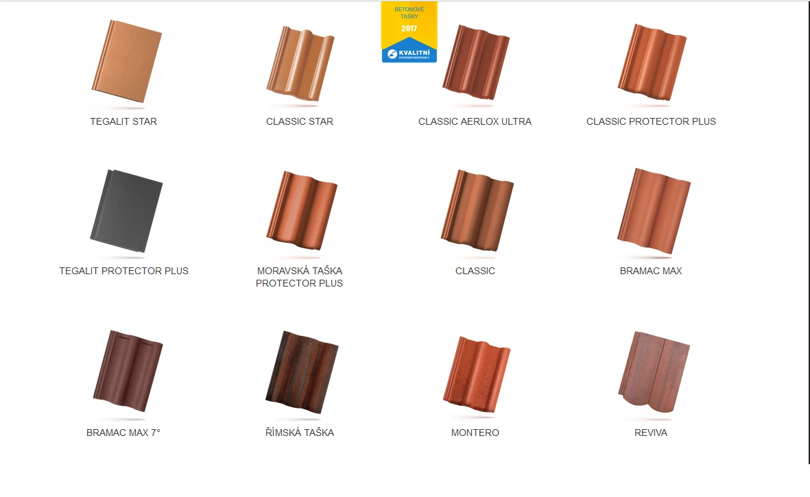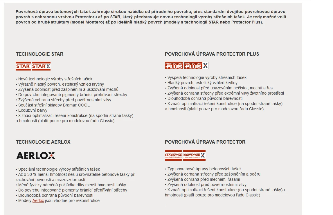 Betonové střešní tašky Bramac jsou vyráběny z vysoce kvalitních surovin: písku, vody, portlandského cementu a pigmentů oxidu železa. Povrchová úprava betonových tašek zahrnuje širokou nabídku od přírodního povrchu, přes standardní dvojitou povrchovou úpravu, povrch s ochrannou vrstvou Protectoru až po STAR, který představuje novou technologii výroby střešních tašek. Je tedy možné volit povrch od hrubé struktury (model Montero) až po ideálně hladký povrch (model Classic STAR). Široká škála barev a rozmanitost profilů tašek uspokojí i ty nejnáročnější požadavky. Výhody betonových střešních tašek Bramac: extrémní pevnost, ekologická výroba, redukce nákladů při pokládce střechy, povrchová úprava Protector, technologie STAR, ochrana proti hluku, nadstandardní záruky.