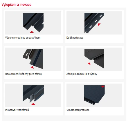 Výsledným efektem je menší riziko zvlnění krytiny vlivem teplotní roztažnosti. Nový tvar zámků zajistí lepší kluznost v místě spojů. Zvýšili jsme nabídku profilací v ploše krytiny, současné čtyři varianty dávají větší prostor pro splnění představ o vzhledu nové střechy. Přidané náběhy v blízkosti zámků zase dokáží eliminovat napětí v krytině způsobené drobnými nepřesnostmi v rovinnosti podkladu.