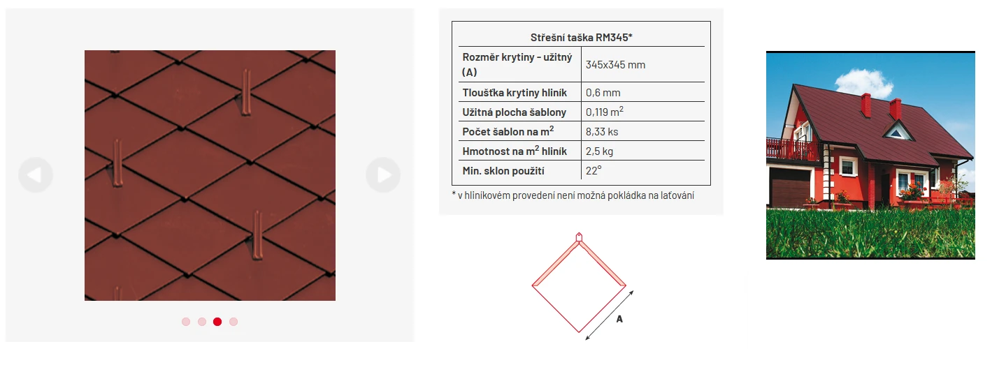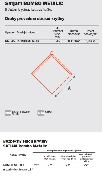 Moderní maloformátové krytiny klasického čtvercového tvaru kladené na koso, nabízející alternativu k vlákno-cementovým krytinám. Teď po boku původní čtvercové tašky stane novinka SATJAM Rombo Metalic. Při zběžném pohledu se obě krytiny neliší, stejný tvar čtverce a stejná délka strany 345 mm. Rombo Metalic má ale vylepšen způsob uchycení o závěsné očko ve vrcholu. Nova úprava umožňuje použití na bednění s vynecháním speciálních příponek. Bez příponek se ale neobejdete u pokládky na laťování, které je u krytiny Rombo Metalic také možné. Realizace s novou úpravou postupuje rychleji, hotová krytina vytváří na střeše dokonalé kosé úhly a ještě vydrží vzdorovat silnějším náporům větru. Mimo vylepšené uchycení má Rombo Metalic také rozšířenou nabídku povrchových uprav. Stejně jako u dřívější krytiny Rombo Premium můžete také nyní sáhnout po krytině Rombo Metalic vyrobené z hliníku.